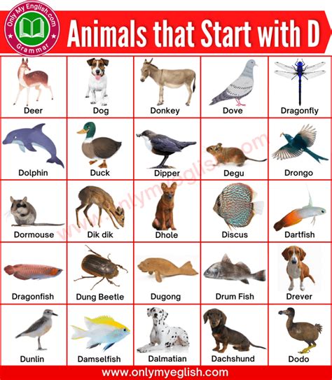 In the english language, animals have different names depending on whether they are male, female, young, domesticated, or in groups. Here is a list of animals starting with d: These are the animals starting with the letter d in animals town.