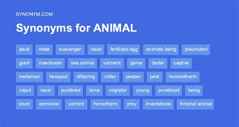 Popular synonyms for animal and phrases with this word. More noun an animal as opposed to a human. Synonyms adult mate scavenger head fertilized egg animate being pleurodont giant insectivore sea.